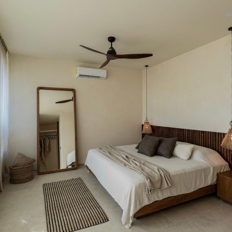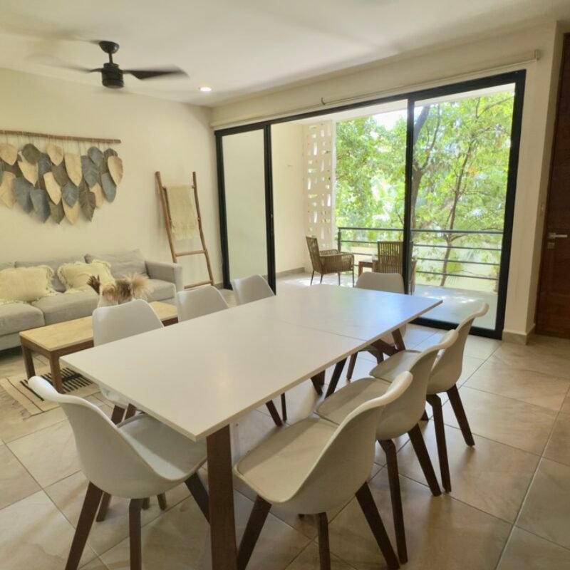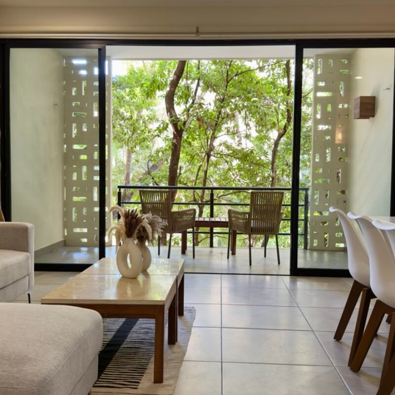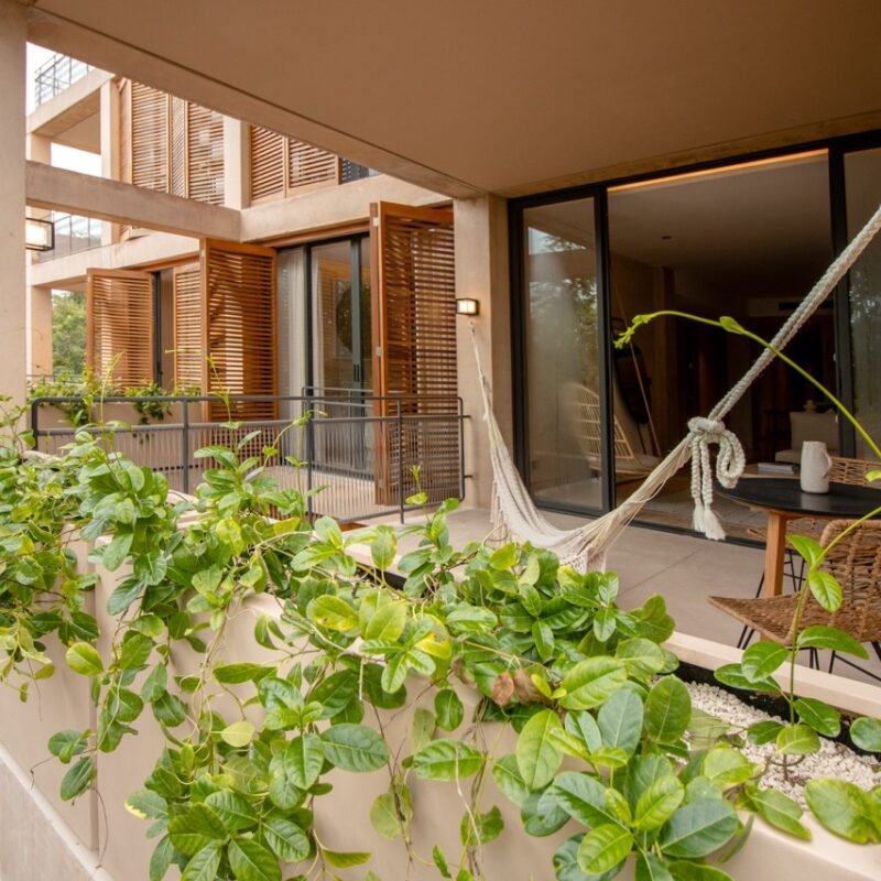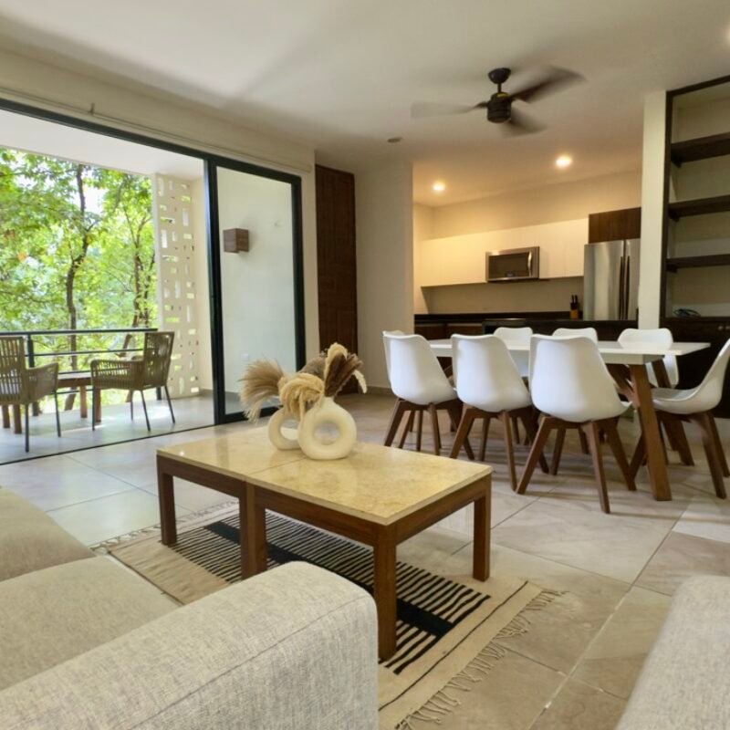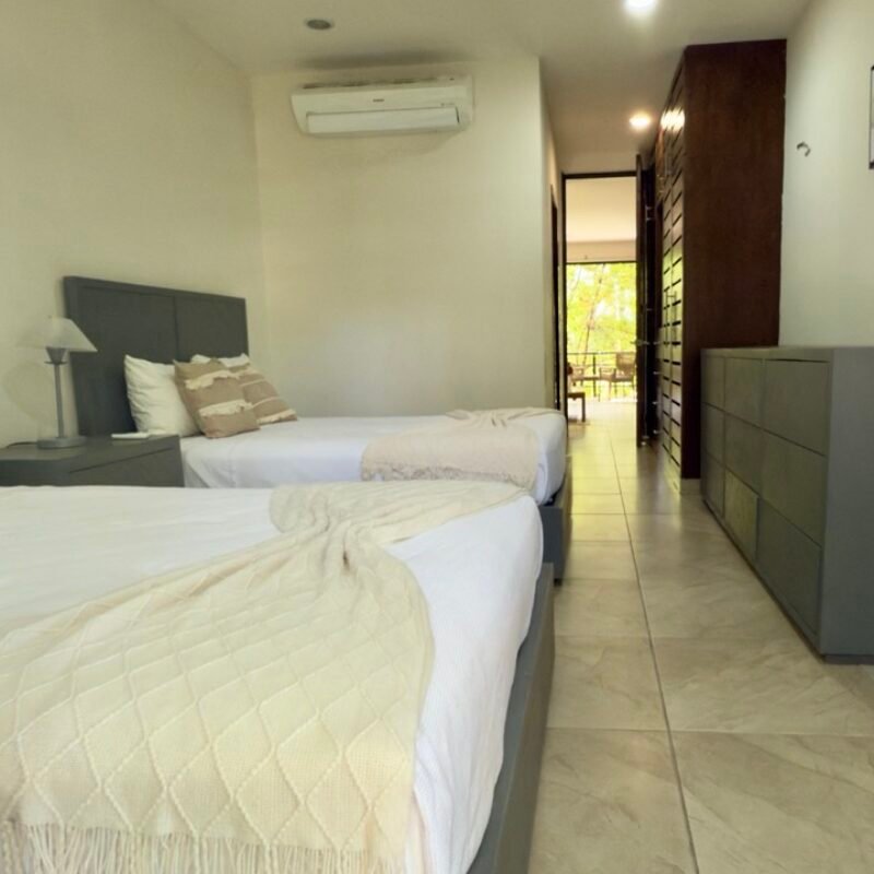 This two-bedroom condominium at Villaggio is located in the heart of Aldea Zamá, Tulum, one of the
