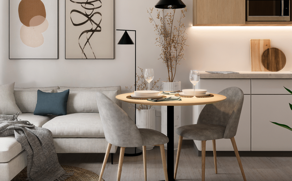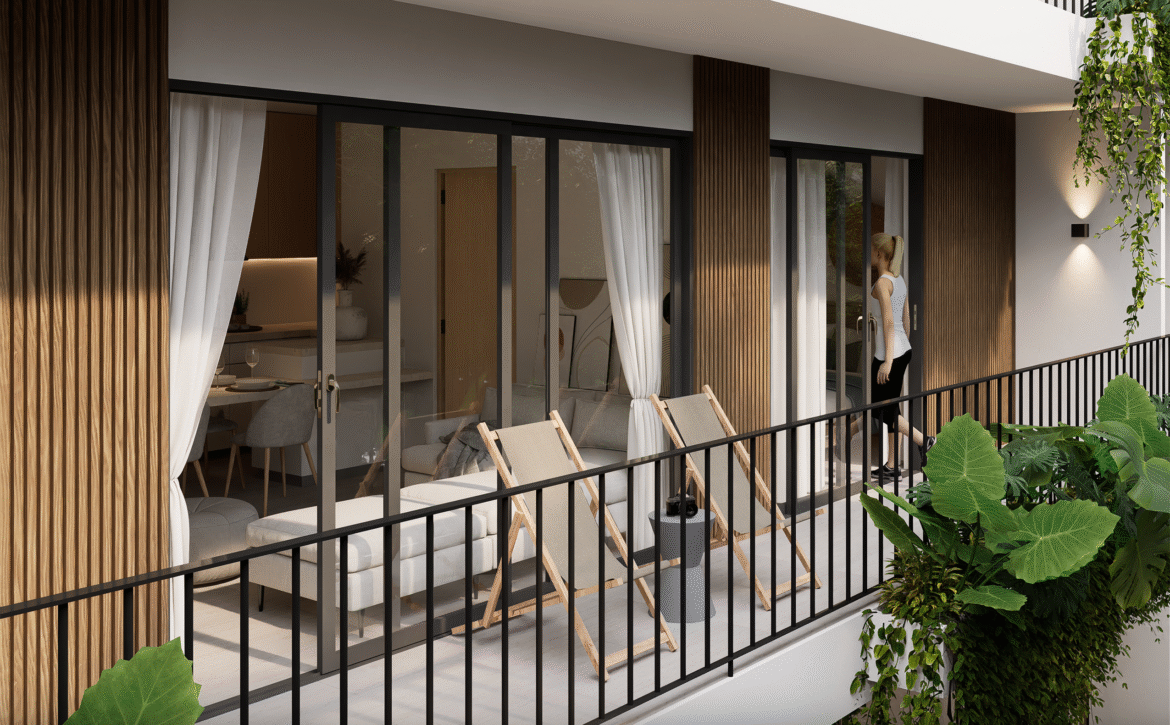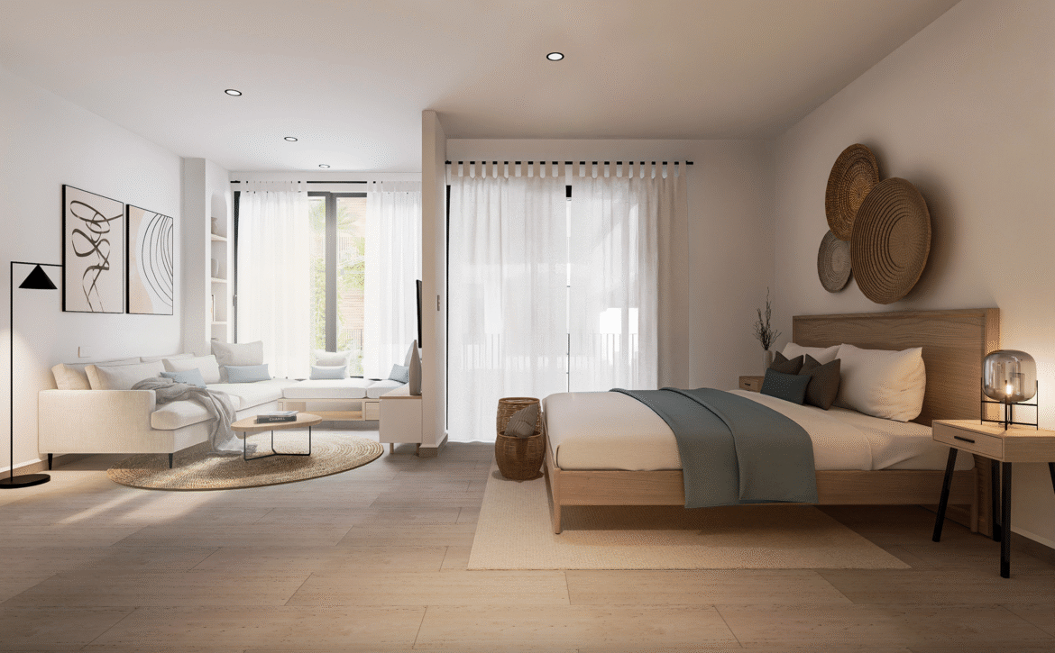 - Studios and apartments with luxury finishes, fully equipped kitchens, balconies, and workspaces